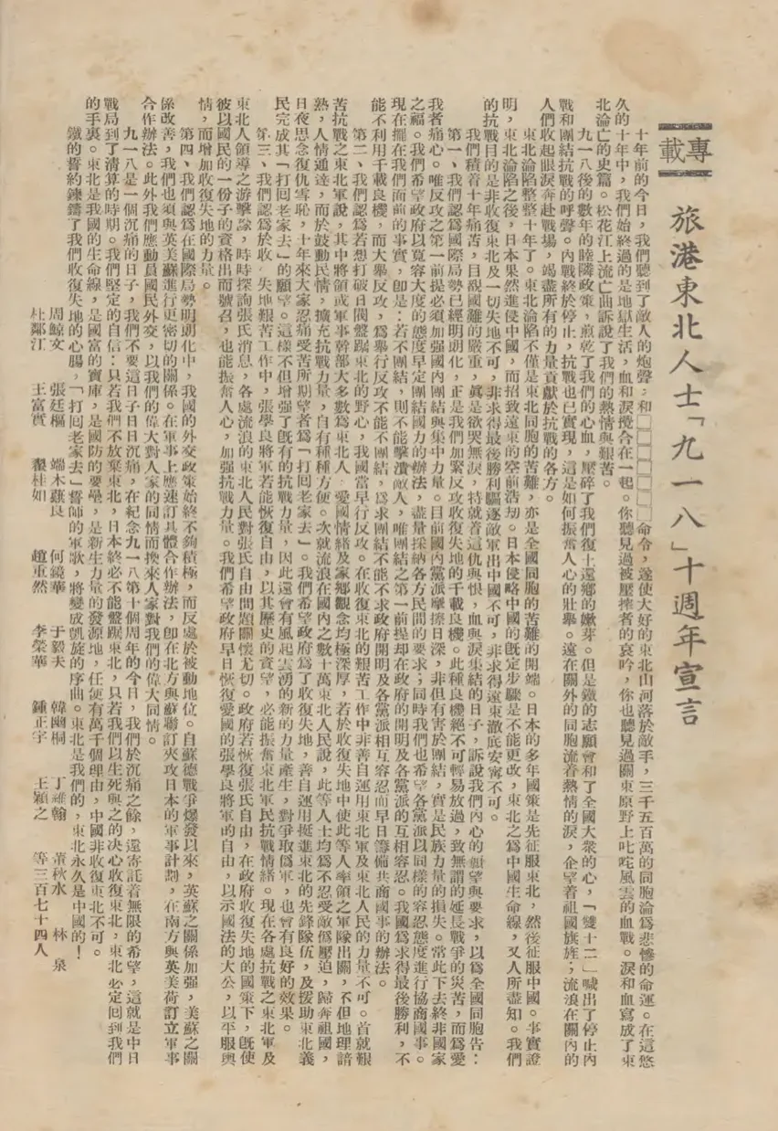 端木蕻良等《旅港東北人士“九一八”十周年宣言》,《時代批評》1941年第4卷第79期