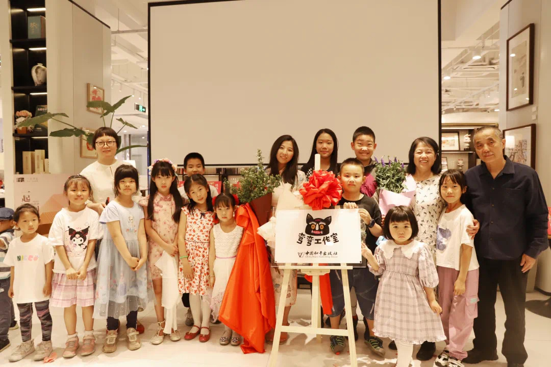 最后,北京航空航天大學新媒體藝術與設計學院教授顏新元為作者獻花,并與劉雪純、彎彎以及小朋友們一起為“彎彎工作室”揭幕。