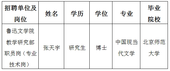 因魯迅文學(xué)院教學(xué)研究部職員崗擬聘人員武茳虹自愿放棄聘用資格,根據(jù)公開招聘工作有關(guān)規(guī)定,遞補張?zhí)煊顬樵搷徫粩M聘人員,現(xiàn)予以公示。公示期間,如有問題,請直接向我單位反映,或通過中央和國家機關(guān)所屬事業(yè)單位公開招聘服務(wù)平臺反映。