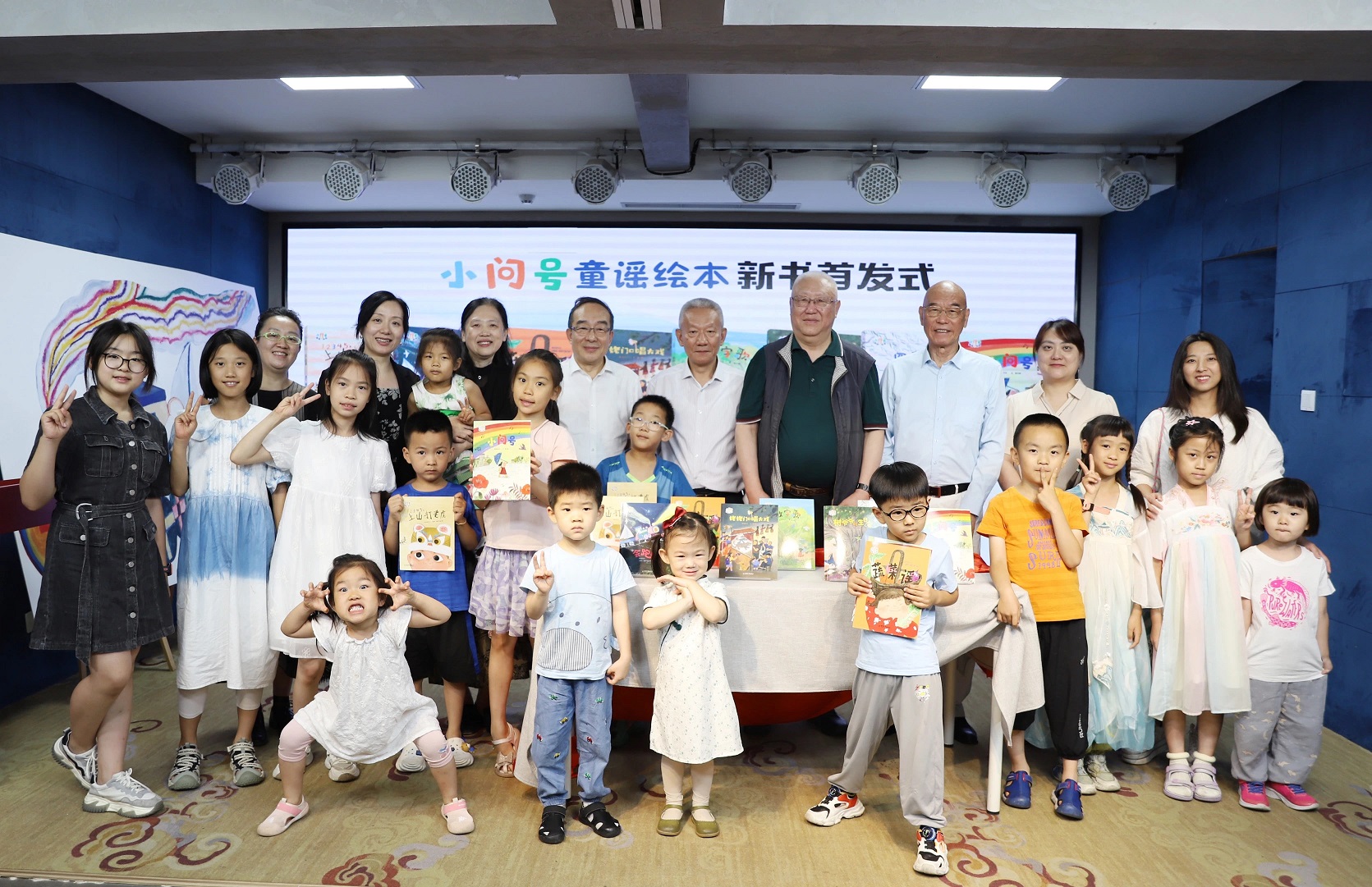鄔書林、高洪波、郭義強、海飛、陳暉、納楊、林云一起為“小問號童謠繪本”新書揭幕,并和現(xiàn)場的小朋友們一起合影。