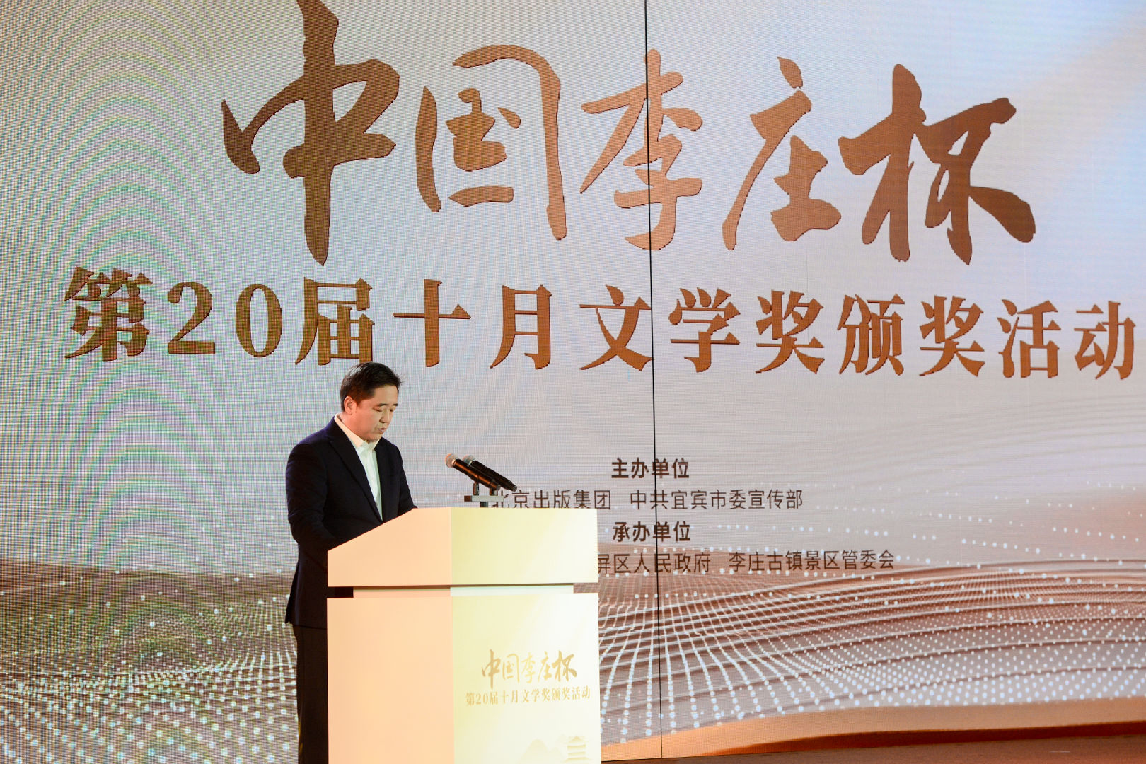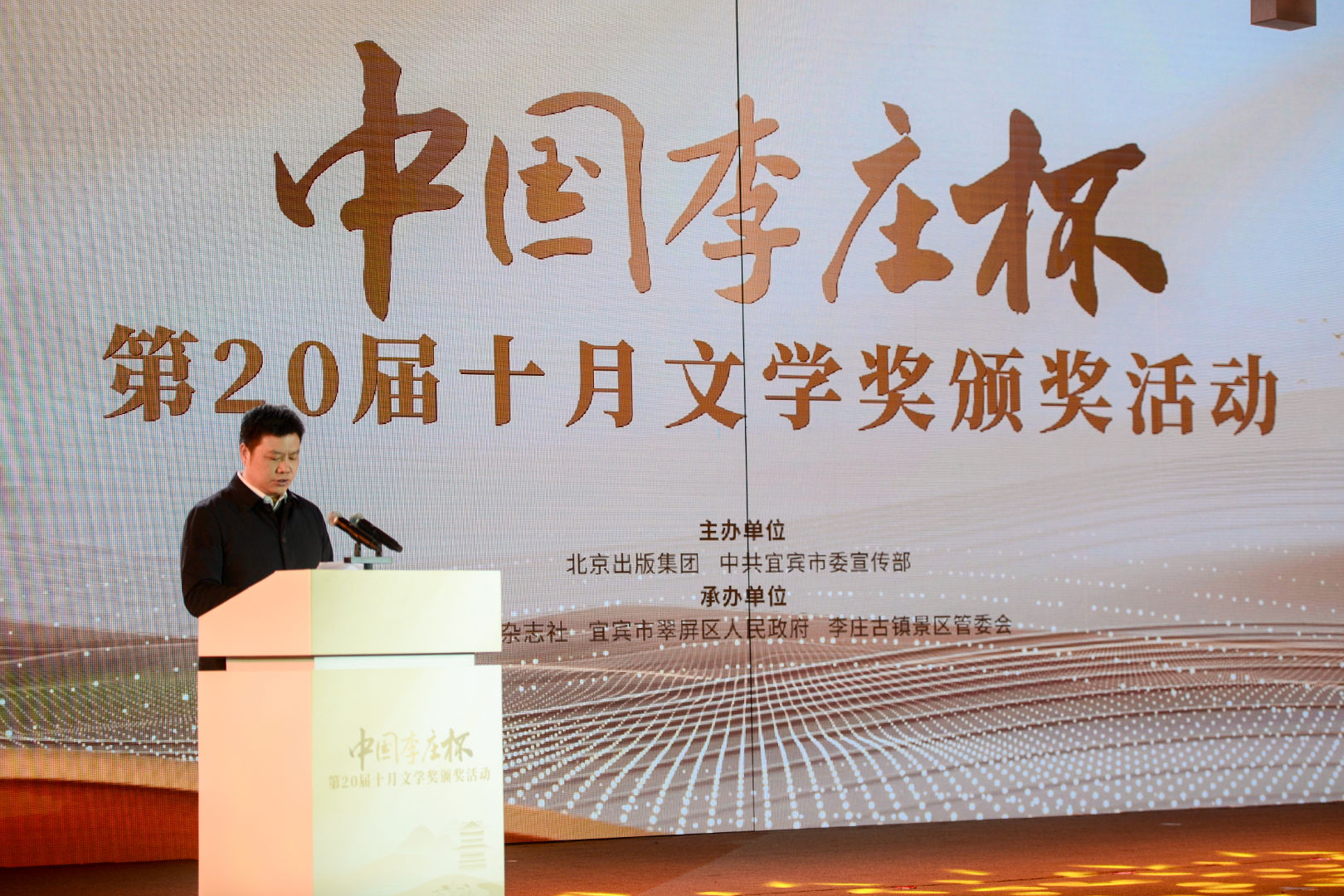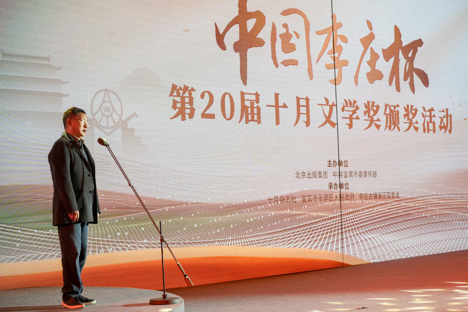 趙彤代表北京出版集團和《十月》雜志社致辭。他表示,今年,具有廣泛影響的“十月文學獎”迎來了第二十屆頒獎典禮,《十月》雜志與“十月文學獎”始終堅守現實主義立場,積極回應時代呼聲,深刻書寫人民的生活與情感,展現了中國文學的時代擔當。作為“十月文學獎”的永久頒獎地,李莊以它博大的歷史與文化,滋養著中國文學的沃土。北京出版集團將繼續牢記文化使命,不斷推動文學創作的繁榮與發展,讓更多有筋骨、有道德、有溫度的作品走向社會、走向讀者,為時代立傳,為人民立言。