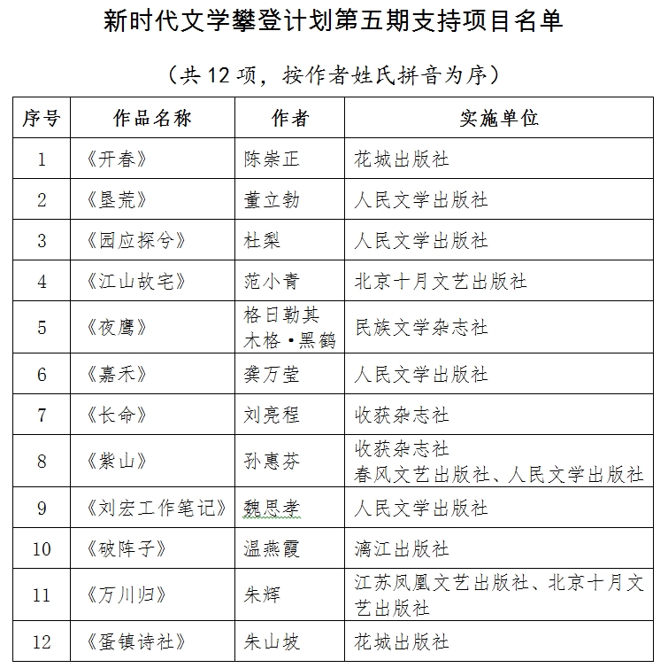 中國作家協會新時代文學攀登計劃第五期共收到申報項目91個。經評審委員會評審,并報中國作家協會書記處批準,確定12個項目入選。