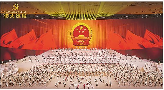 但舞臺藝術電影又不只是亦步亦趨地真實記錄。在他看來,舞臺有一套自己的敘事邏輯,但電影需要建立起電影語言的敘事邏輯。電影導演必須在尊重舞臺敘事的基礎上,運用電影語言構建清晰的鏡頭邏輯。電影導演首先要搞清楚作品所講的內容。“《偉大征程》中既有音樂舞蹈史詩的敘事邏輯,又有背景大屏幕專題片的歷史敘述,兩者在某些段落產生沖突。為此,我們通過大量的鏡頭組織與剪輯工作,明確了每個段落的主題與節奏,使其在銀幕上呈現出結構清晰、層次分明的敘事語言。”在音樂邏輯方面,《偉大征程》作為一部情景史詩、一場沉浸式演出,現場氛圍的營造同樣是需要考慮的。因此在這部電影中,主創團隊錄制了大量的現場環境聲,包括歡呼聲等,后期又錄制了許多音響效果,在錄音棚通過混音重新構建了一個沉浸式的聽覺空間。在舞臺空間與電影視覺呈現的關系方面,侯克明認為舞臺藝術電影需要盡量突破舞臺限制,創造更具電影感的空間。因此在其他幾部作品中,侯克明盡量避免舞臺大幕與側幕條的過多出現,以突破舞臺的局限性。而《偉大征程》有所不同,大量保留了觀眾席的群眾反應鏡頭,并通過舞臺大銀幕中的畫面延展出去,以期更好表達舉國歡慶的熱烈氛圍。