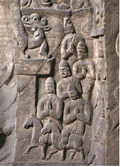 在西域諸國中,粟特人以善于經商聞名。粟特位于中亞阿姆河和錫爾河之間的澤拉夫珊河流域,大約在今烏茲別克斯坦境內,地處歐亞大陸交通樞紐。得天獨厚的地理優(yōu)勢,令粟特人成為絲綢之路上的重要貿易者,推動中原與西域交流互動。十六國以來,粟特商人曾活躍在涼州(今甘肅武威)一帶。太延五年(公元439年)北魏太武帝平定北涼后,粟特商人及親屬隨民眾一起遷至平城(今山西大同)。從商人的形象及文獻中對粟特人善于經商的記載來看,這支商隊或許便來自粟特。