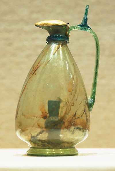 在遼寧省博物館“山河與共——遼金歷史文化主題文物展”現(xiàn)場,一個(gè)精美的遼代玻璃瓶吸引不少觀眾駐足欣賞。此瓶出土于遼寧省朝陽市北塔,輕薄晶透,瓶口似鳥首,柄柱似鳥尾,整體猶如一只昂首蹲坐的小鳥,瓶中還有一長頸弧腹小瓶,設(shè)計(jì)十分巧妙。據(jù)介紹,這件玻璃瓶產(chǎn)自波斯(今伊朗),反映了遼與西亞的經(jīng)貿(mào)文化交流。