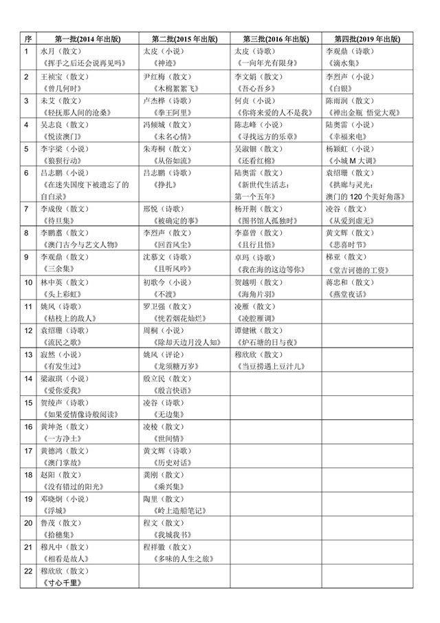 “澳門文學叢書”自2012年開始啟動,啟動以來已出版了四批共66冊,包括2014、2015、2016、2019年推出首批22冊、第二批21冊、第三批13冊以及第四批10冊的澳門文學作品。是次出版的一套13冊第五批叢書連同第一至四批,共出版79冊,分散文、詩歌、小說三種體裁,涵蓋當今澳門文壇具有廣泛代表性的作家和作品,忠實反映澳門文學的全貌。