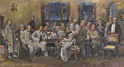 有別于以原色為主的歐洲古典油畫(huà),沈堯伊的《遵義會(huì)議》特意減弱畫(huà)面色彩飽和度來(lái)還原會(huì)議樸素、真實(shí)的場(chǎng)景,既忠實(shí)于歷史,又烘托出深沉凝重的氣氛。這件作品不僅填補(bǔ)了革命歷史題材美術(shù)創(chuàng)作的空白,更為黨史研究貢獻(xiàn)了珍貴圖像資料,也為其他同題材美術(shù)創(chuàng)作提供了重要參照和啟示——既要深入探尋與研究歷史真相,也要不斷完善和探索主題的最佳表現(xiàn)方式。創(chuàng)作者要將自己置身于歷史情境之中,用心體悟每一個(gè)人物的造型與精神面貌,以超凡的藝術(shù)感受力與通感力再現(xiàn)中國(guó)革命歷史。