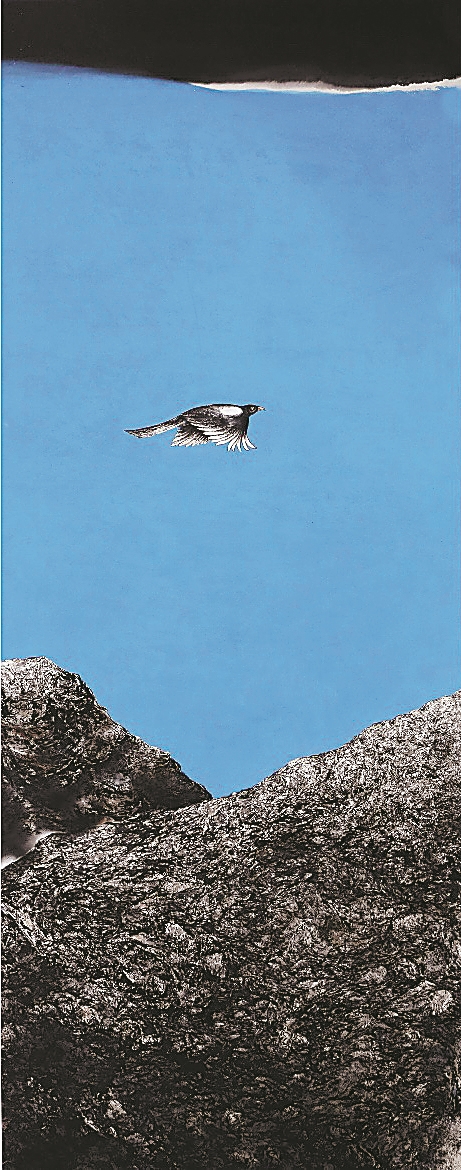 易新建的山水畫以大開大合的構圖建構和宏偉雄闊的神韻,通過工致細密的皴法反復積染、疊加得以形成頗具節奏感和韻律感的亞抽象意境,這種神韻和意境亦真亦幻、亦虛亦實,“惚兮恍兮,其中有象,恍兮惚兮,其中有物”。在他筆下,意象圖式暗藏云蒸霞蔚、巍峨巨嶂、奔流江河、清泉印月、羚羊佇立、飛鳥凌空,無一不蘊含著藝術家對萬物的情懷、對山河的摯愛以及由此產生的心境傾訴,藝術家的心靈徜徉于超越時空、幽邃靜謐的審美幻境,在天澄水清、氣韻升騰的寰宇間格物致知、放逸情思……易新建將中國傳統山水畫與西方素描的黑白灰關系、油畫的光影變化以及版畫的切割式力感、設計的創意性互滲融會,由此走向了頗具新語境和新境象的當代山水畫拓新之路。