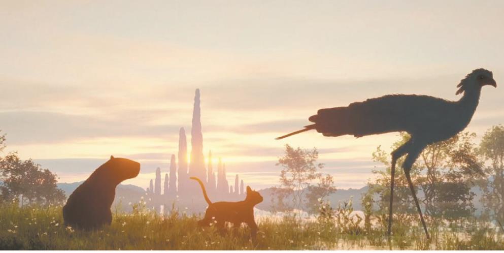 當然,《貓貓的奇幻漂流》最大的吸引力也不在于這些簡明的隱喻和解讀,它沒有深刻復雜的寓意,但是,它呈現了深刻、壯觀的美。導演說,在這個故事里,拉幫結派的蛇鷲幫和不知感恩的狗群都不是“反派”,如果一定要界定“反派”,那就是恐怖的自然之力,那一股沒有任何生物個體能抵抗的、毀滅性的力量。電影所呈現的,正是面對“天地不仁”,在毀滅和生存的縫隙里,仍然能看到超越生死、與時間同存的美。在野蠻生長的森林里,人類活動留下的廢墟是美的,夕陽下的巨大雕塑是美的,半淹沒在水中的宮殿和城市的遺址是美的;洪水無情上漲,高山成為小島,在如血的夕陽里,龐然巨鯨躍出水面,這個畫面是悲涼的,但也是美的;甚至,暴風雨肆虐的黑夜,巨浪打散無數舢板,高山沉入水下,這場景是可怖的,但這摧枯拉朽的場面在影片的分鏡里,仍然是美的。自然的洪荒之力不可對抗,這群弱小的動物們在搖搖晃晃的帆船上,不知道死亡和明天哪個先來,但是它們抬頭看到燦爛的晚霞鋪滿遠近的水面。