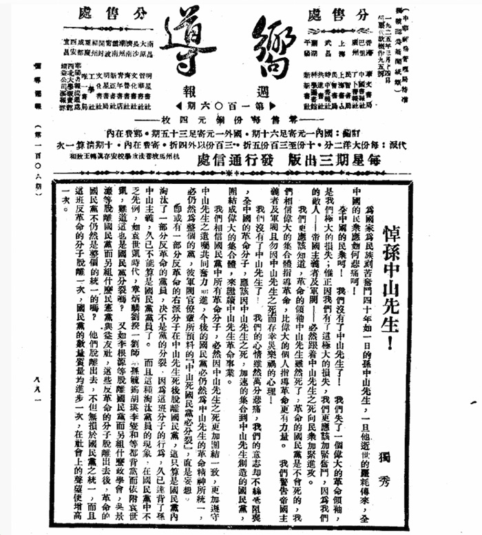 陳獨(dú)秀在《向?qū)А返?06期發(fā)表《悼孫中山先生!》一文