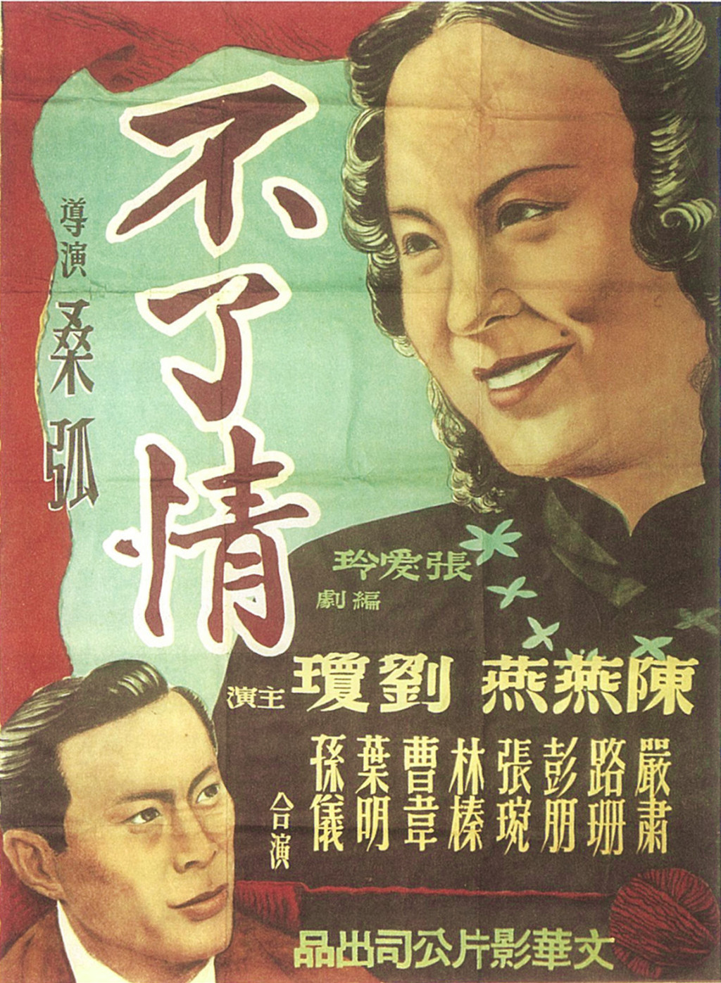 緊接著,情感的拉絲更細更密也更長的《不了情》在國泰戲院登場。電影海報上有對“健康的主題”宣告:“揭露舊式婚姻的病根!指出男女戀愛的正道!”(電影《不了情》廣告,香港《大公報》1951年5月21日);也有以導演之名趁熱打鐵的召集:“《哀樂中年》導演桑弧又一巨獻”“本院連滿一百一十場之《哀樂中年》大導演”(電影《不了情》廣告,香港《大公報》1951年5月24日);不過,比導演名更居視覺中心、字體也更大的是編劇“張愛玲”。此時的張愛玲,還在解放后的上海:她以筆名“梁京”在《亦報》上連載了長篇小說《十八春》,桑弧期待這是她“創(chuàng)作生活上的再出發(fā)”(叔紅[桑弧]:《推薦梁京的小說》,上海《亦報》1950年3月24日),她也以這個筆名為桑弧導演的新片《太平春》寫了影評;她還在夏衍的關注下,參加了“上海市第一屆文學藝術(shù)工作者代表大會”。因為《不了情》,她的名字出現(xiàn)在香港海報和報紙上的時候,《十八春》已在報上連載完,她可能為單行本的出版忙著修訂,也可能已經(jīng)在著手寫中篇小說《小艾》,幾個月后它又將在《亦報》上連載。