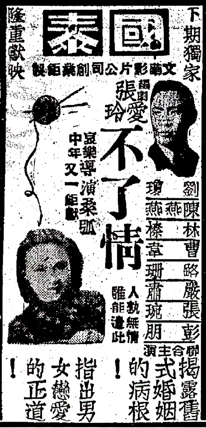 影片《不了情》在國泰戲院的上映時間不長,從5月23日到31日,仍是“連日滿座”,似乎應和與印證著海報上的那句:“人孰無情,誰能遣此”?