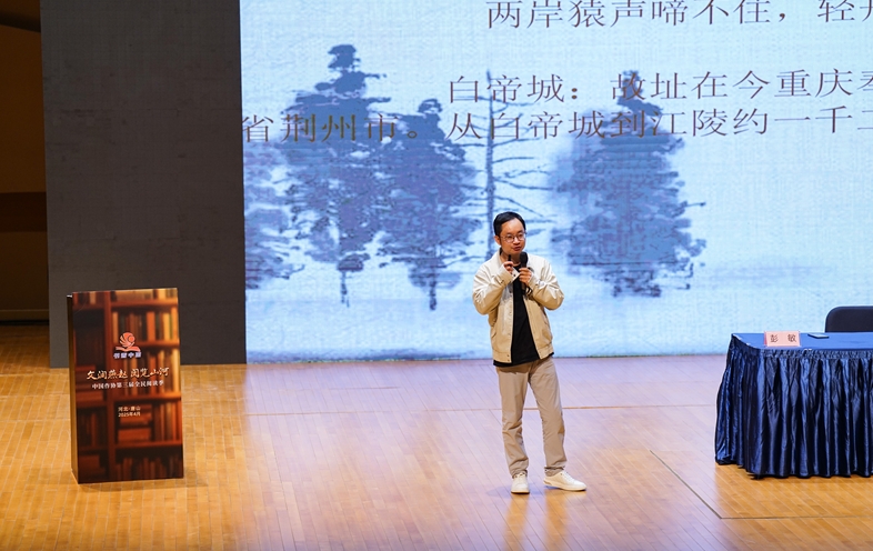 彭敏面向初中生主講《詩詞背后有乾坤》,聚焦古詩詞背后的歷史故事與文化內(nèi)涵。他打破“標簽化”的詩人形象,通過解析李白、杜甫等詩人的人生軌跡與創(chuàng)作背景,帶領(lǐng)學生理解詩詞中的情感邏輯與人文精神,感受古典文學跨越千年的生命力,引導(dǎo)青少年從詩詞中汲取文化養(yǎng)分。在問答互動環(huán)節(jié),彭敏帶來了歷史背后的有趣知識——端午節(jié)最初究竟是紀念誰的?屈原吃過粽子嗎?由此鼓勵學生們在閱讀中積極探索,主動追問,培養(yǎng)勤于思考拓展知識的良好習慣。