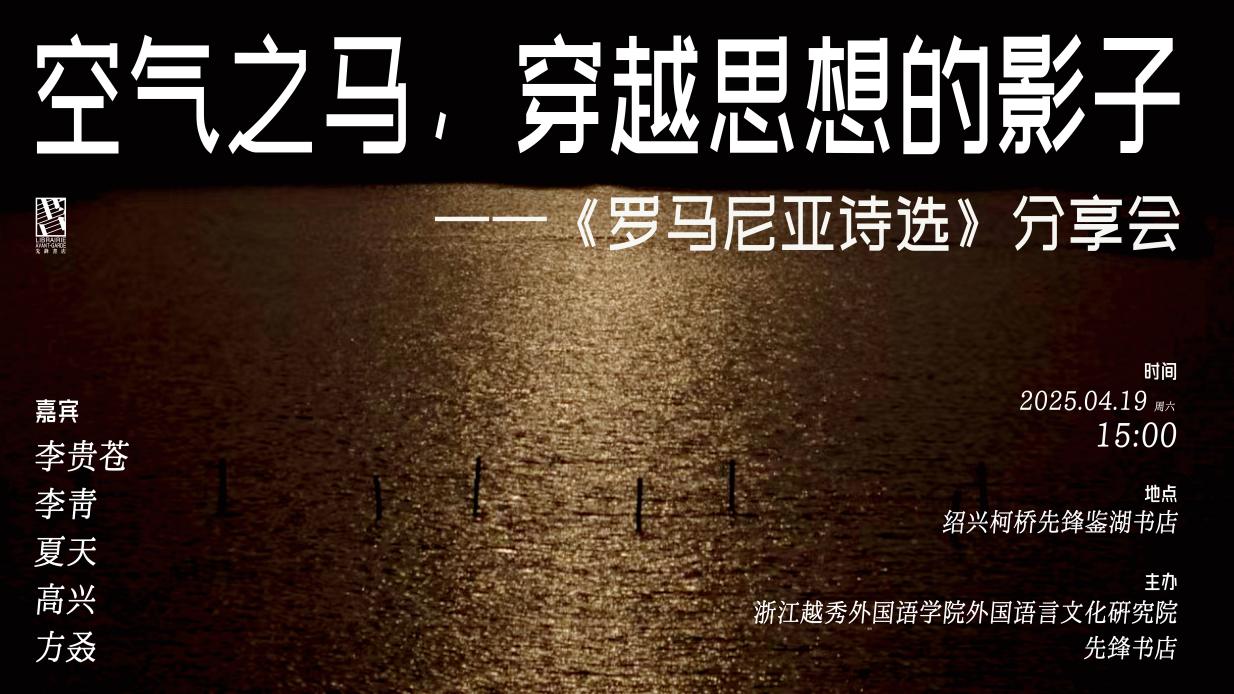 4月19日,由浙江越秀外國語學院外國語言文化研究院和先鋒書店聯合主辦的《羅馬尼亞詩選》分享會在紹興柯橋先鋒鑒湖書店成功舉辦。本次分享會主題為“空氣之馬,穿越思想的影子”,譯者高興攜新書與多位學者、詩人、編輯及青年學子齊聚一堂,通過朗誦、對談與學術演講,共同探索羅馬尼亞詩歌的文學價值與跨文化傳播意義。