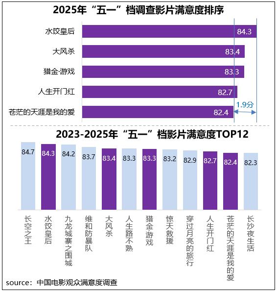 中國電影觀眾滿意度調(diào)查?2025年“五一”檔調(diào)查結(jié)果顯示,“五一”檔電影觀眾滿意度得分83.6分,同比增長0.4分,為近年來同期調(diào)查的春季及“五一”檔期滿意度第一位。2025年“五一”檔電影市場延續(xù)多元化內(nèi)容供給,滿意度主調(diào)查的五部影片類型題材各異,且都以較為優(yōu)質(zhì)的創(chuàng)作獲得了觀眾“滿意”評價,并首次實現(xiàn)在“五一”檔主調(diào)查的影片全員突破82分,其中《水餃皇后》以84.3分奪得檔期冠軍,《大風殺》、《獵金?游戲》分別以83.4分、83.3分居第二、第三位。