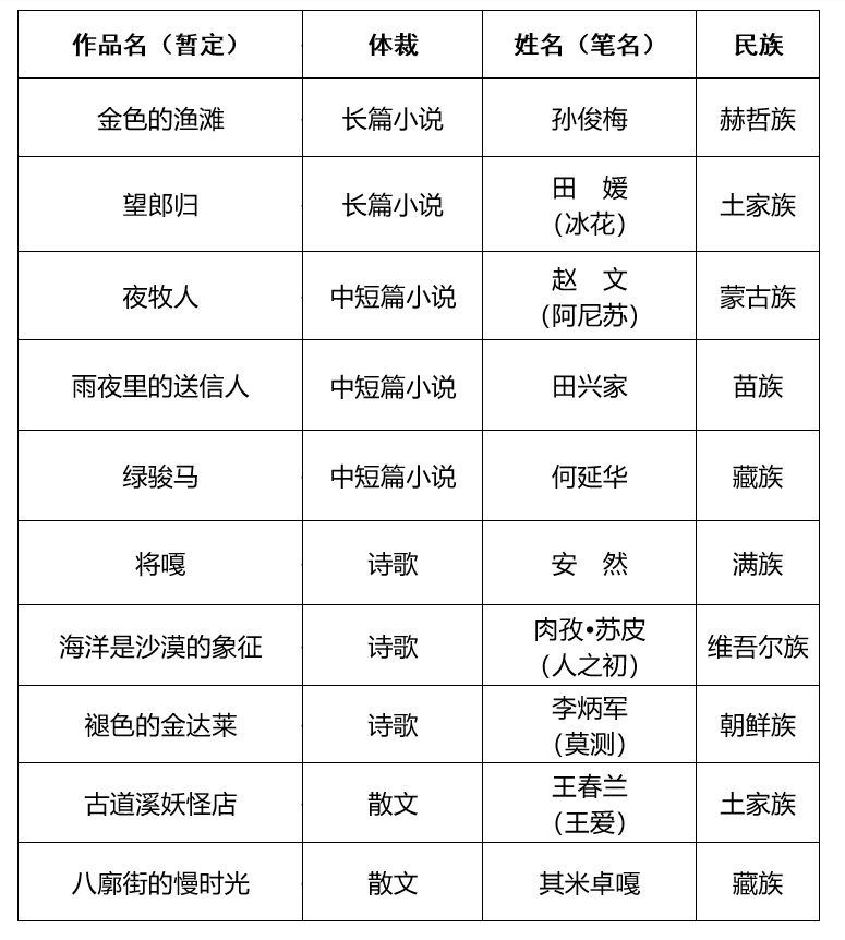 中國作協(xié)2025年度“鑄牢中華民族共同體意識·中國少數(shù)民族文學(xué)之星叢書”項目經(jīng)過專家論證和中國作家協(xié)會書記處審批,已確定入選作品10部,擬由作家出版社出版。