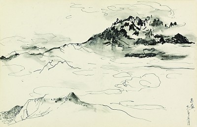 其間,吳冠中連續一個多星期冒雨在玉龍雪山寫生,只為捕捉雪山最真實的面貌與氣韻。他頂風冒雨,衣履盡濕,卻始終不曾放下畫筆。在他的藝術人生中,這是一次飽含虔誠與執著的山水朝圣,也是一場屬于畫者與自然之間的深情凝視。那些誕生于雨霧之中的作品,被他視作珍寶。《云南行》中描繪玉龍雪山的速寫寫生有7張之多,每一幅都顯現出他對自然萬象的敏銳感知和獨到表現。他用靈動的線條勾勒出雪山連綿起伏的脊線,筆觸輕盈而不失力度,極具節奏韻律。與傳統山水畫不同的是,他運用現代構成理念,將“寫意”與“寫形”融為一體。在描繪雪山氤氳霧氣時,他更是以指代筆,用沾有淡墨的指腹在紙面上反復揉搓,形成云氣繚繞、山色朦朧的視覺效果,使畫面呈現出介于具象與抽象之間的微妙張力。這些速寫作品中,黑與白的碰撞、線與面的交融、動與靜的對比,被吳冠中巧妙地組織在有限的畫幅中,構成強烈的視覺節奏與空間起伏感。他擅長在“空”中見“實”,以極簡的筆墨營造出極富厚度的山岳氛圍,使玉龍雪山在畫中呈現出既高遠又飄逸、既雄渾又婉約的多重表情。這種速寫風格并非單純記錄景致,更是吳冠中藝術理念的深度體現,速寫不在于速,而在于寫——寫境、寫神、寫意。他的速寫,是創作的“胚胎”和“構思之母”,更是自由心靈的產物。