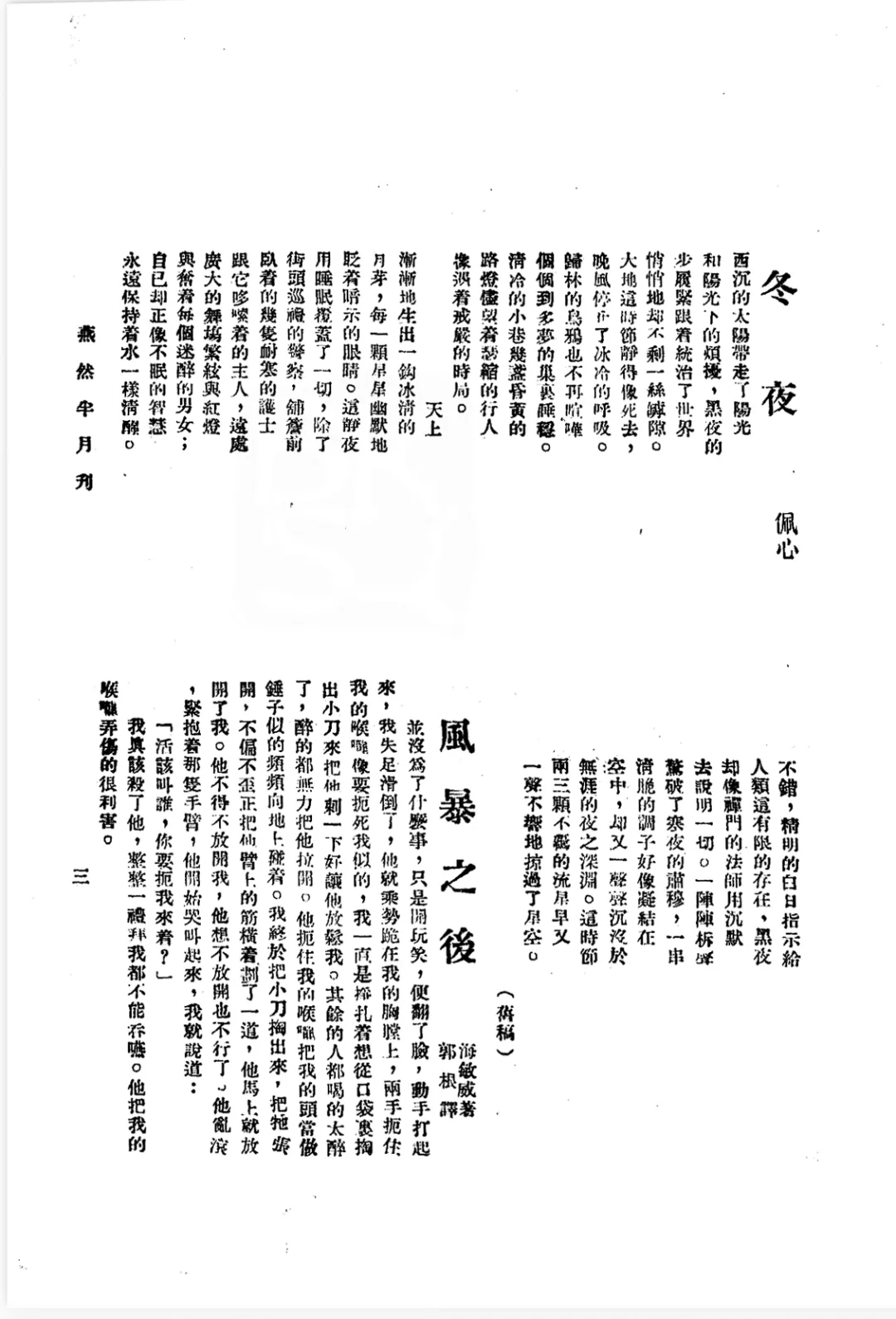 海敏(明)威:《風暴之后》,郭根譯,《燕然》1936年第4期