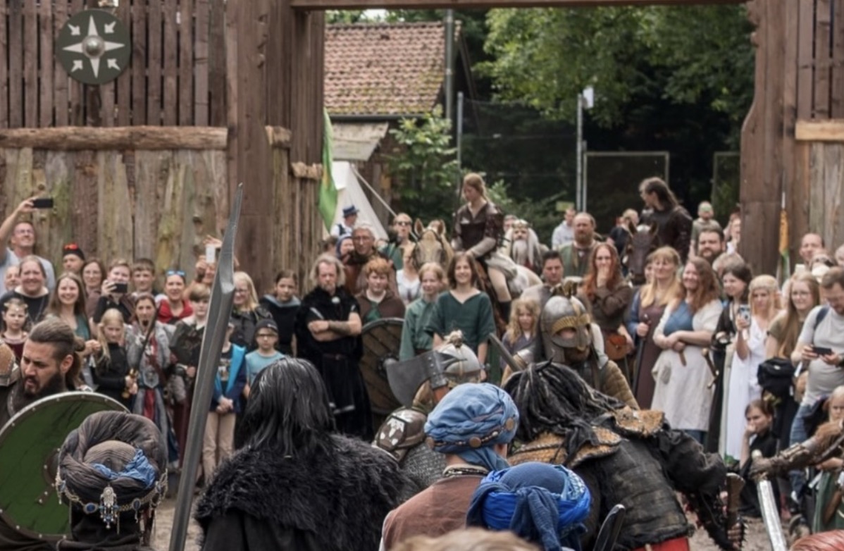 五月末,我抵達德國北威州的Geldern,正逢一年一度的托爾金節。下火車后,我步行穿過一片林地,遠遠地看見草地上升起了帳篷,煙火繚繞,有人在河邊磨面,有人在棚下用古式木工打造手斧,有孩子身著霍比特服飾在泥地上追逐。一時間,我并不覺得自己“進入了中土”,而是仿佛走進了一場確實存在于歷史里的村落節慶,沒有現代音樂,沒有熒光色,沒有塑料。只有火堆、吟唱、木頭、弓箭,以及手寫的精靈語標牌,認真的,不容嘲諷的。