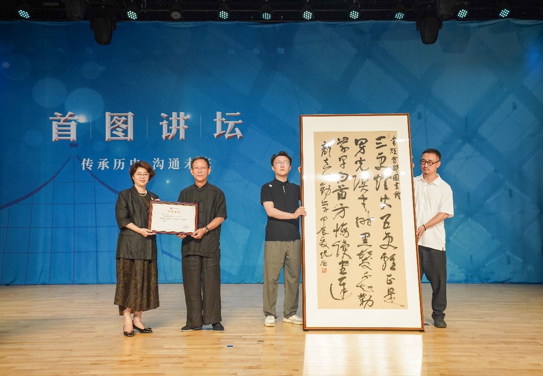 吳悅石先生(左二)向首都圖書館捐贈書法作品《勸學·顏真卿》