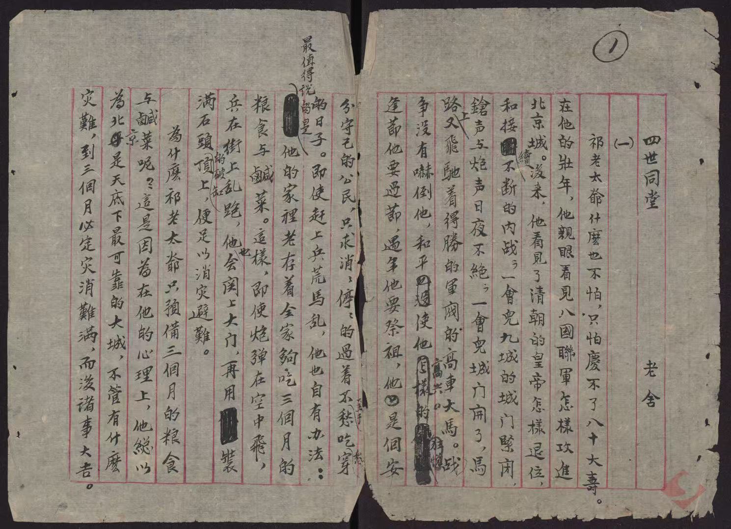 《四世同堂》是老舍先生的經典長篇小說,一部百萬字的巨著,小說以恢宏的敘事與地道的“京味”城市書寫,幾乎復原了老北平的民俗畫卷,有記憶中的家國安寧、人情醇厚,也有現實的仇寇鐵蹄、遍地血雨,書寫了抗日戰爭時期北平淪陷后普通百姓的生活,寫盡了復雜人性。這也是現代文學中杰出的抗戰小說,完整地呈現著十四年抗戰史。按老舍先生自己的話說,這部小說是對抗戰文藝的一個較大的紀念品。這么重要的一部小說,它的手稿還存世嗎?這份手稿背后又有著怎樣的傳奇故事呢?
