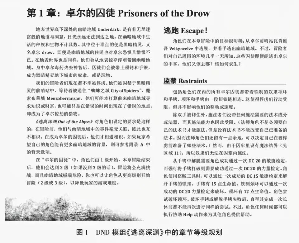 我們對比初版(OD&D)規則和后續規則會發現,初版規則中并沒有怪物的等級,只有角色的等級,主持人只能通過怪物的數值來估算挑戰難度。而后續我們熟知的“怪物挑戰等級”(Challenge Rating.CR)則在2000年的第三版規則中才首次被引入。我們可以由此推出,作為優化補充內容而出現的CR系統,是玩家與DM在游玩中實際需求的回應:CR系統幫助DM平衡遭遇戰難度,方便DM規劃出適合不同等級的玩家的冒險內容。在這個“規劃”中,根據怪物等級、出現地圖與相關聯情節的“內容模塊”已經漸漸出現。名為“挑戰等級”而非“怪物等級”,其實在背后反映著游戲對玩家角色升級的引導。升級和新內容模塊之間的對應關系已經開始出現,開放之下的“線性”已初露端倪。