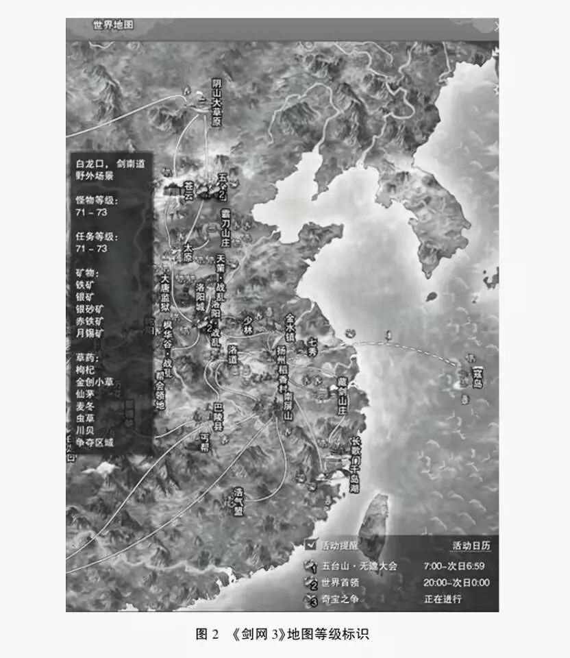 但在如今的開放世界游戲中,大多也保留著“升級”這一隱性導航機制。游戲設計者們也面臨著《龍與地下城》初版規則一般的疑問:如何在開放自由的世界與自主的玩家行為中,把握游戲的敘事節奏,平衡游戲難度?除卻鳳毛麟角的設計④,大部分“公式化開放世界”采用的仍然是升級導航機制,如《刺客信條·起源》與其后的系列作品,相對于《刺客信條》系列前作,似乎去除了隨劇情解鎖區域的限制,擁有全解鎖的地圖,顯得更加“開放”,但仍靠區域的怪物等級壓制,將玩家的行動軌跡圈定在角色等級允許的范圍內,生成相對線性的流程。與之類似的是網絡游戲,如《魔獸世界》《劍網3》等,網絡游戲往往也是一種開放世界游戲,擁有全開放的地圖與自主的玩家行為。但《魔獸世界》和《劍網3》均標注出“地圖建議等級”,并以此延伸出官方的“建議升級流程”,在開放世界中用“升級”勾勒出線性的玩家行為軌跡。