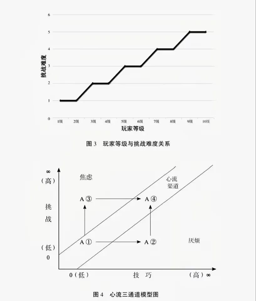 在游戲設計中,心流與升級機制息息相關。正如前文所論證的,在標志升級機制成熟的《龍與地下城》游戲中,升級這一機制最開始是為了給DM調控遭遇戰難度,并更好地規劃出一條相對線性的游戲內容。在強調技能程度和挑戰難度關系的心流理論中,升級機制起到了對這種關系進行“動態調控”的作用:玩家在升級后進入新地圖,敵人的難度對于玩家是高的、具有挑戰性的,隨著玩家戰斗經驗的累積,玩家再度升級,自身能力提升,地圖中的敵人難度會相應降低,此時往往會迎戰地圖關卡的高難度BOSS,戰后再度升級,進入新的等級地圖,從而進入一種階梯狀的難度循環。如果我們將這種玩家升級和難度體驗之間的關系畫出一幅折線圖,我們會發現它與心流理論的三通道模型圖非常相似——很多游戲正是利用升級,來保證玩家始終處于心流的體驗中。