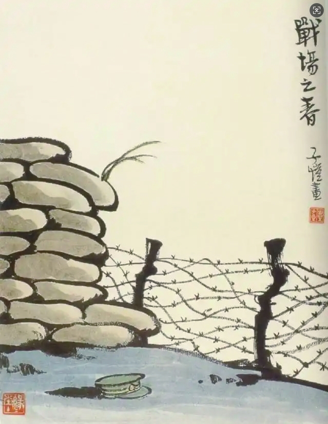 豐子愷堅信抗戰必勝,其漫畫作品灌注必勝的信念,充滿鼓舞人心的力量。他曾說:“古語云:‘眾志成城’,我們四百兆人團結所成的城,是任何種炮火所不得攻破的!”他的漫畫作品尺幅小,題材微,卻具有強烈的藝術感染力。比如《生機》和《戰場之春》,主角均為一株小草,纖細柔弱,一棵從灰暗的斷壁中探出頭來,一棵在冰冷的鐵絲網邊昂首向天,寥寥數筆,生機立現。《戰場之春》中題詩曰:“誰言爭戰地,春色渺難尋。小草生沙袋,慈祥天地心。”殘酷的戰場上,小草頑強生長,印證著天地的慈祥之心,好生之德。