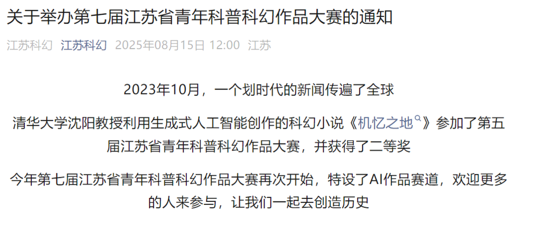 AI科幻作品賽道的出現源于2023年清華大學沈陽教授在參加第五屆江蘇省青年科普科幻作品大賽時的獲獎作品《機憶之地》,該作品是利用生成式人工智能進行的創作,付昌義表示,設置這一賽道主要是出于三方面考慮:“一是科幻的核心是探討科技與人類未來的關系。AI 賽道直接呼應了當下人工智能倫理、人機關系、后人類主義等熱門議題,讓作品更具現實關聯性。二是 AI 技術正在改變我們的創作方式。比賽通過增設賽道,推動創作者探索人機協作的新模式,拓展科幻表達的邊界。比如AI可能提供人類難以想到的情節設定或視覺設計,而人類負責把控主題和情感深度。三是回應與深化當下關于AI創作的爭議性討論。比如AI 生成內容如何定義原創性?人類作者的核心價值是什么?人類的創作能力是否被稀釋? 也許優秀的 AI 賽道作品,正可以展現人類主導的不可替代性。”