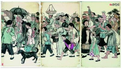 張安治的三聯畫《避難群》,表現的是在日軍空襲預警中緊急避難的桂林百姓。近四十名男女老幼簇擁成驚惶的人流,每個人都被賦予了獨特的外貌特征與情感狀態。盲人拄杖、婦女抱兒、孩童牽母、主仆相扶,或頂籃、或提箱、或挑擔、或背包,步履慌亂間,生活的重量和命運的無常一并壓在肩頭。而那些粗布衫下繃緊的肌肉線條,因急促呼吸而鼓脹的衣襟褶皺,亦在烘托緊張不安的氣氛。畫面最左側,畫家描繪了一位回望的婦女,在她的腳邊還有一只緊緊追隨的黑狗,其忠誠天性令人感慨。婦人的視線讓人不禁想象:她在望什么?是身后已經看不見的家人,還是遠處那可能永遠回不去的家?這是對家、對故鄉本能眷戀的一望,然而,她身后已無家可回,身前其實也無路可走。
