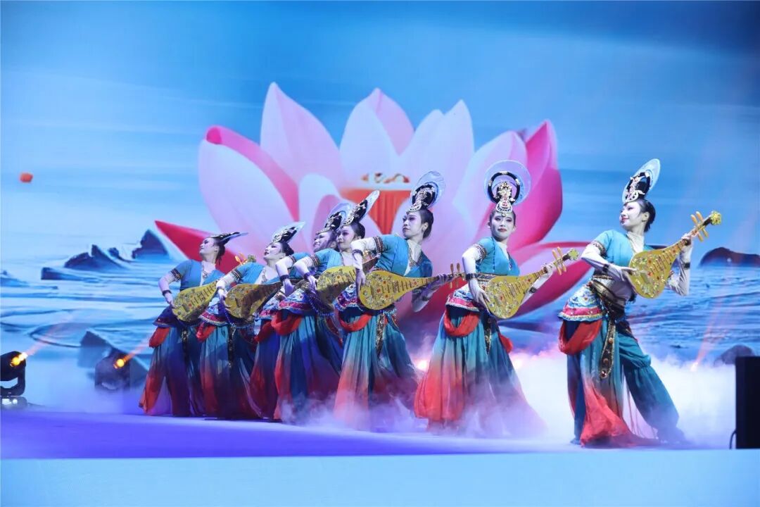 如果說《天下朋友》演繹的是一出熱忱好客的迎賓曲,那么唐代詩人白居易《琵琶行》開篇“主人下馬客在船”表達的就是一份希望遠方賓朋多留片刻的真摯情感。千年之前,白居易到潯陽江邊送客,因江面上傳來一陣琵琶聲留住歸程,也成就了“音樂詩中的千古絕唱”。《風起東方》旋律響起,十余位舞者身著初唐時期較為普遍的雞心領短襦和青色合歡袴,手持金色琵琶,在舞臺上翩翩起舞。在舞蹈節目《琵琶行》中,舞者們迎風擺動的衣裙,飄飄翻卷的彩帶,仿若從盛唐時期敦煌莫高窟的飛天圖壁畫中走出來,走進不夜長安的詩歌狂歡。弦音流轉間,“嘈嘈切切錯雜彈,大珠小珠落玉盤”的意韻猶在;琵琶聲聲響,傳遞出跨越山海的詩意和鳴。