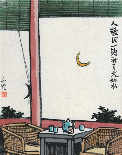 之所以是“古詩新畫”,在于豐子愷在研讀古代詩文時,真切感受到其穿越時間的魅力。宋代蘇軾提出“詩畫本一律”之說,明確了詩畫相通的理論。豐子愷在《畫中有詩》自序中談道:“余讀古人詩,常覺其中佳句,似為現代人生寫照,或竟為我代言。蓋詩言情,人情千古不變,故好詩千古常新。”就像其成名作《人散后,一鉤新月天如水》,就源于宋代詞人謝逸《千秋歲·詠夏景》中的最后一句。