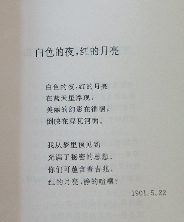 白色的夜,紅的月亮/在藍(lán)天里浮現(xiàn),/美麗的幻影在徘徊,/倒映在涅瓦河面。/我從夢里預(yù)見到/充滿了秘密的思想。/你們可蘊含著吉兆,/紅的月亮,靜的喧嚷?(《勃洛克抒情詩選》,汪劍釗 譯)