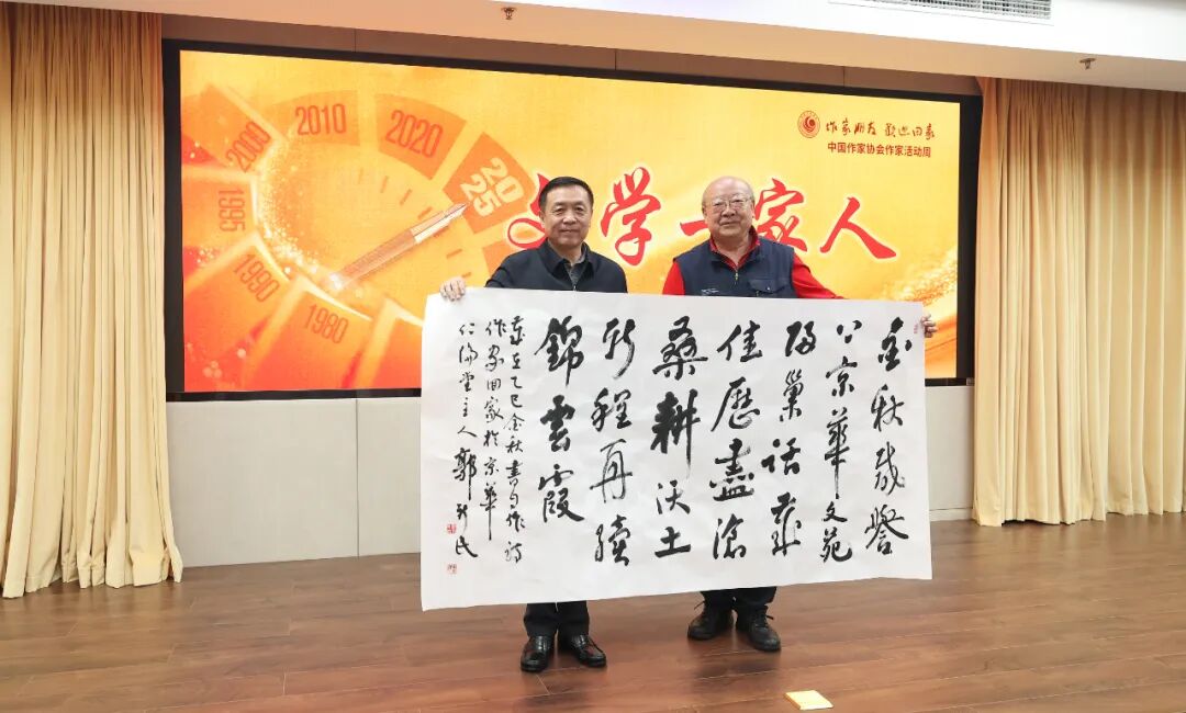 活動(dòng)現(xiàn)場(chǎng),大家還互相贈(zèng)送了書畫作品,“回家”的老作家們與魯院高研班學(xué)員互贈(zèng)書法、繪畫作品。詩人郭新民特意為此次作家活動(dòng)周創(chuàng)作了一首古體詩:“金秋載譽(yù)上京華,文苑歸巢話歲嘉。歷盡滄桑耕沃土,新程再續(xù)錦云霞。”他以書法作品的形式將其贈(zèng)予中國(guó)作協(xié)。