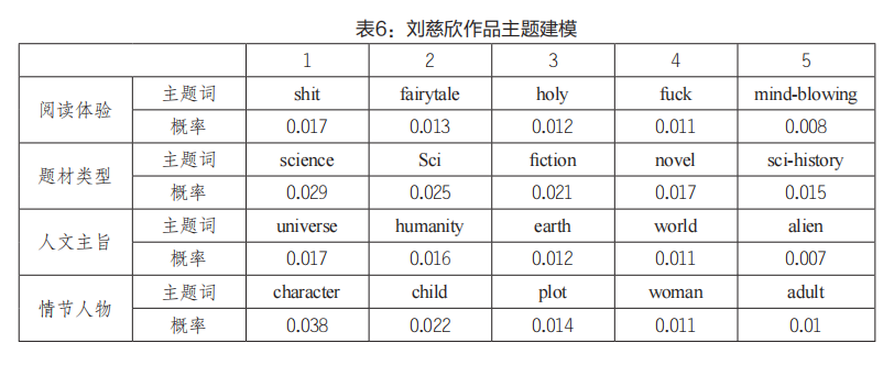 根據(jù)表6所示,劉慈欣的作品主題主要包括閱讀體驗、題材類型、人文主旨、情節(jié)人物、文化背景和翻譯技術(shù)等六個方面。讀者對劉慈欣作品的閱讀體驗既有積極評價也有消極評價,如主題中的正面詞匯“fairytale”“holy”“mind-blowing”,以及負(fù)面評價詞匯“shit”“fuck”,表明讀者對作品的評價和偏好存在主觀差異。其他的五個主題基本上是正面評價為主,劉慈欣作為中國科幻小說的代表,對海外讀者產(chǎn)生了強大的吸引力。主題詞中“world”“universe”“ sci-history”等主題詞反映了現(xiàn)實與科幻的關(guān)系,引發(fā)了讀者對地球的敬畏、對文明的思考等人文關(guān)懷,深受讀者喜愛。此外,“character”“plot”“civilization”“translation”等主題詞反映了小說中人物塑造的方式、文化背景、翻譯質(zhì)量等方面,體現(xiàn)了讀者對作品關(guān)注的視角。