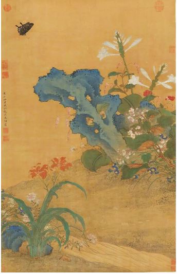 明代畫家文俶是著名畫家文徵明的玄孫女,她擅畫花卉蟲蝶,創作出諸多精美的花鳥畫作。她曾繪有一幅《秋花蛺蝶圖》,如今收藏于天津博物館,畫面中描繪了初秋之際花卉盛開,蝴蝶翻飛,流水潺潺的美麗景象。狹窄的溪流兩側鮮花盛開,色彩鮮艷,有藍色的雛菊、粉嫩的竹節海棠、橘色的萱草、白色的玉簪、粉白的紅蓼、艷紅的石竹以及其他諸種草花。挺拔嶙峋的太湖石立于花草之間,既豐富了畫面內容,增添畫面層次,又調和了畫面色彩。畫面左上方,一只黑色蝴蝶被繁花吸引而來,正扇動翅膀,緩緩落下。畫家對花卉的刻畫十分精準,傳神勾勒出不同花卉的花朵形態。在刻畫萱草花朵時,畫家綜合運用留白、勾線、暈染等多種手法,巧妙呈現出花瓣上的色彩變化和紋理結構,使筆下的花卉生動傳神,別具風姿。