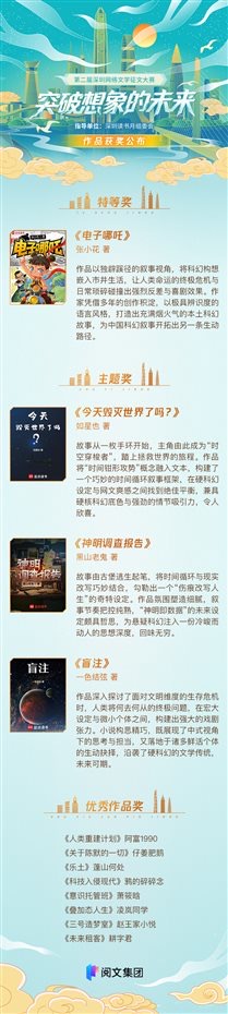 本屆征文大賽以“突破想象的未來”為主題,聚焦科幻IP孵化,挖掘精品網(wǎng)文故事,下設“未來人類生活”“新技術下的新冒險”“自由意志的新生命”三大方向,共征集參賽作品兩萬余部。其中,《電子哪吒》獲特等獎,《今天毀滅世界了嗎?》《神明調(diào)查報告》《盲注》獲主題獎,《人類重建計劃》等8部作品獲得優(yōu)秀作品獎。
