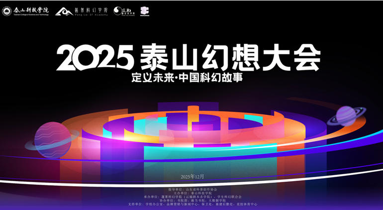 12月6日至7日,由山東省科普創作協會指導,泰山科技學院主辦,蓬萊科幻學院(云端劇本殺學院)、學生科幻聯合會承辦的2025泰山幻想大會系列活動在山東泰安泰山科技學院舉行,本次活動的主題為“定義未來:中國科幻故事”。中國作協主席團委員、中國作協科幻文學委員會主任劉慈欣,中國科幻銀河獎、華語科幻星云獎終身成就獎獲得者王晉康,科普時報社社長、中國科普作家協會原副理事長尹傳紅,世界華人科幻協會主席韓松,復旦大學中文系教授、博士生導師嚴鋒,泰安市科協四級調研員陳金輝、科普部部長韓盛濤,泰山科技學院常務副校長謝承紅、副校長丁海奎、校長助理武浩然,重慶移通學院通識教育學院執行院長皮若蘭,蓬萊科幻學院(云端劇本殺學院)副院長宋亞潔,以及楊楓、楊平、凌晨、江波、寶樹、超俠、楊晚晴、分型橙子、海漄、孫強、游者、袁振民、姚明、鈦藝、伯爵大人、賈天軻等科幻作家、編輯、評論家、從業者,《科幻與想象力》通識課程學生代表和齊魯科幻聯盟學子500余人參加了本次活動。